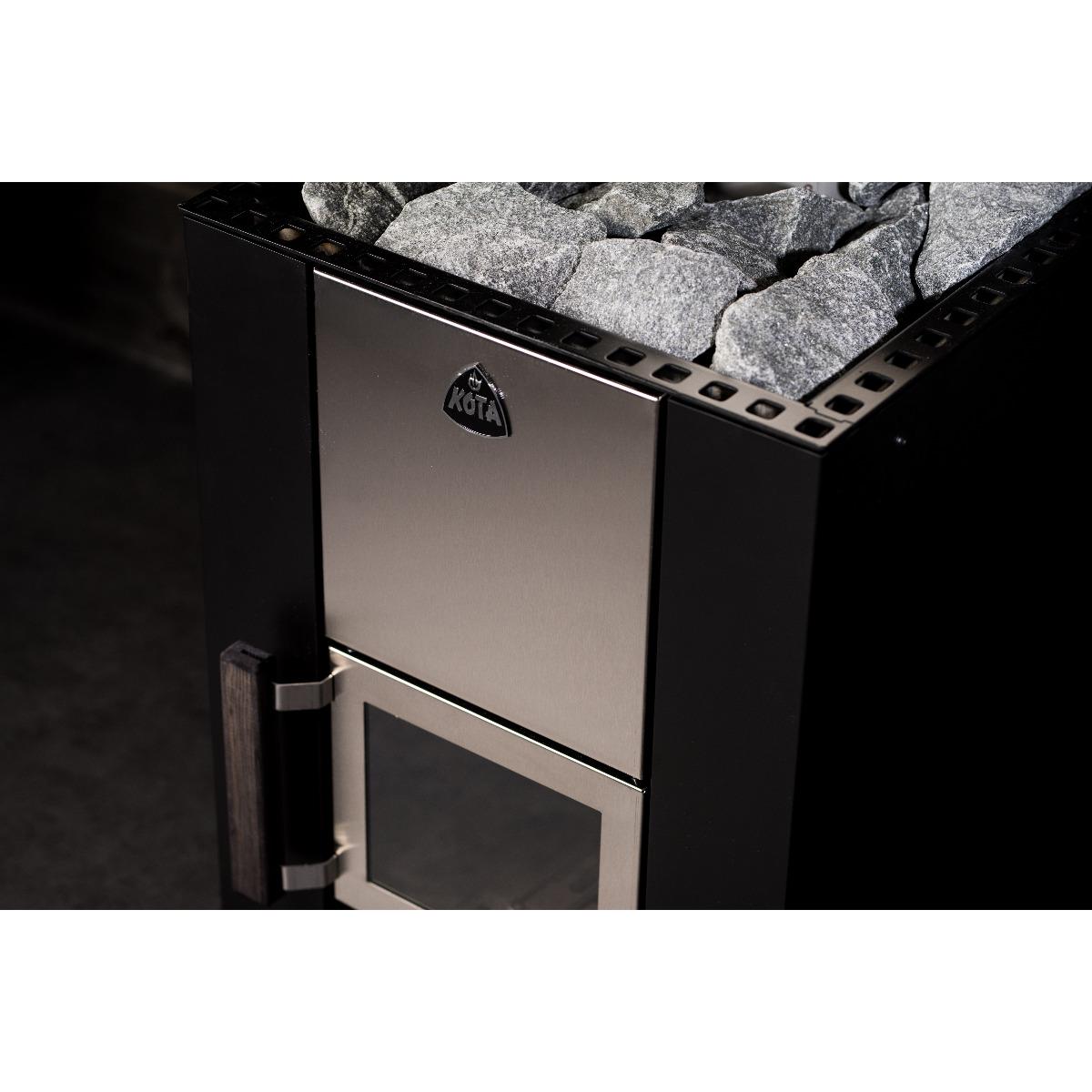 Featuring a stylish glazed door, the Kota Kuru 14 offers users the added luxury of enjoying the live fire during their sauna session. The black-painted steel housing creates a sophisticated and elegant atmosphere, while the wooden handles make the heater easy to use and handle.