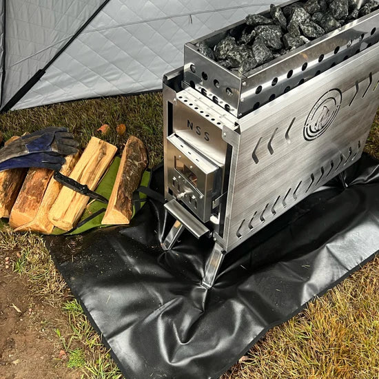 Fireproof mat: Measuring 3 x 4.5ft, our fireproof mat offers a generous coverage area to safeguard your tent sauna environment. Simply place the mat on the ground, set up your stove on top of it, and experience peace of mind. Whether you’re worried about embers falling or potential heat damage, this mat has got you covered.